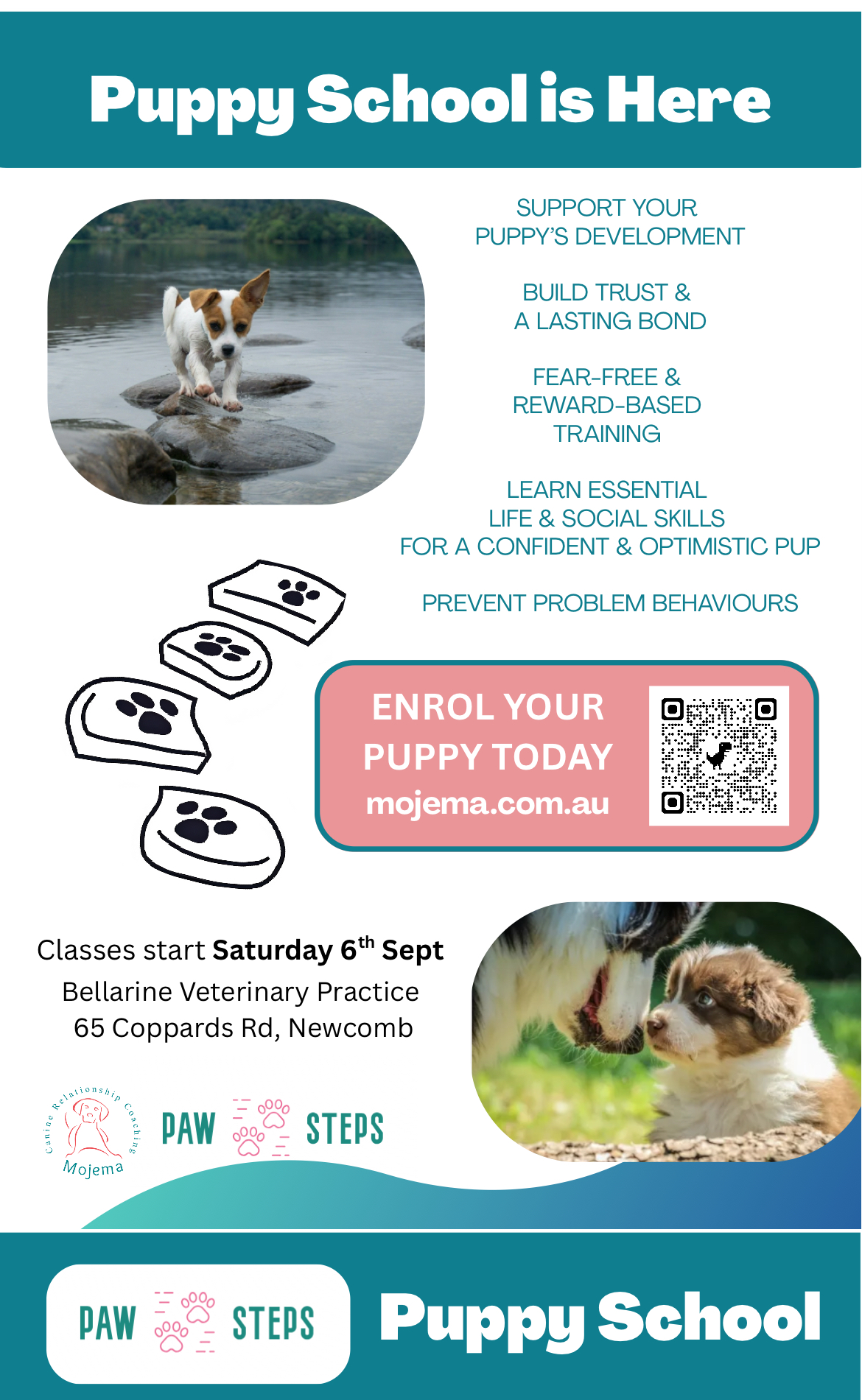 Puppy school will recommence for the warmer seasons on Saturday, 6th September in our training facility at Newcomb. This service will be run by Natalie from Mojema Canine Relationship Coaching
